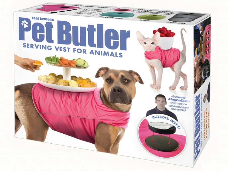 Dieses Produkt ist genau das Richtige für Sie, wenn es Sie stört, dass Sie Überstunden machen, um Ihren Hund zu versorgen, während er den ganzen Tag schlafen darf und keine Miete zahlen muss. Theoretisch könnte Ihr Hund mit dem „Pet Butler“ – einem Set aus Weste und Serviertablett – herumlaufen und Snacks anbieten.