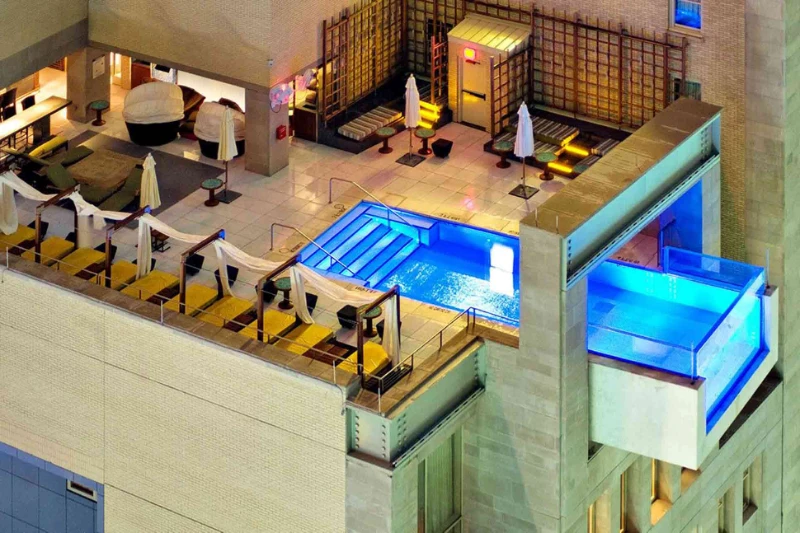 テキサス州ダラスにあるこの豪華なホテルは、Joule Hotel 内にあります。10 階にはインフィニティ プールがあり、プレキシガラスの壁とコンソールが端まで伸びています。そのユニークなデザインにより、スイマーはホテルの端から泳いでいるように感じるかもしれません。プールからはダラスの素晴らしい景色を眺めることができます。プールで静かな休憩を楽しんだり、おいしいカクテルや水からの食事を味わったりできます。