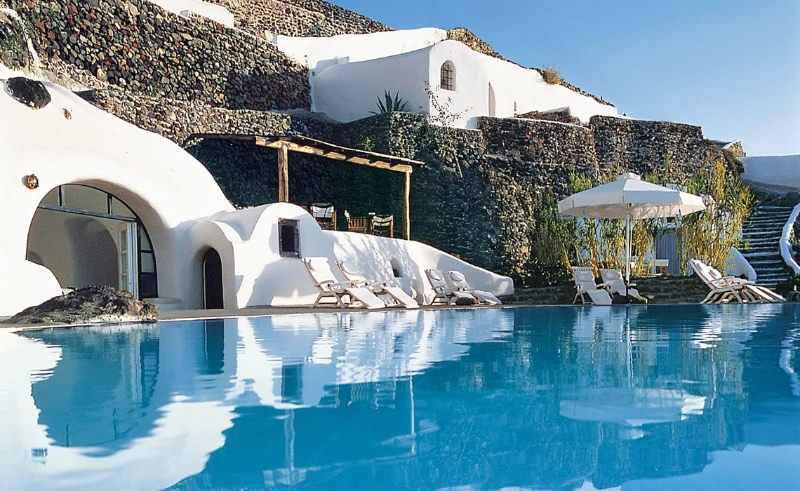 Perivolas Hotelは、ギリシャのサントリーニ島にあるエーゲ海を見下ろす崖の上に位置しています。インフィニティ プールは、ホテルのテラスから海を見渡すことができます。エレガントなプールは、サントリーニ島の白い伝統に沿って、自然環境に溶け込むように設計された建物に囲まれています。プールの岸辺からは、ターコイズブルーの空に加えて、無限のプールがどこで終わり、どこから海が始まるのかわかりません。Perivolas Hotel は、そこで休むか泳ぐかに関係なく、とても魅力的で平和な場所です。