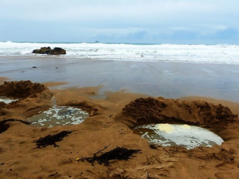 このビーチを訪れる人々は、砂浜に穴を掘ってその中に浸かる光景を楽しむことができます。砂の下を流れる温かい水が心地よく、自然のスパのような体験を提供します。この温かい水は、リラックスを求める人々にとって理想的な環境を作り出しています。
