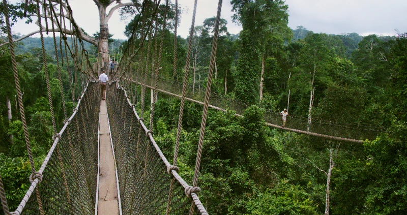 ガーナのカクム国立公園を他の国立公園とは一線を画すユニークな特徴が 1 つあります。熱帯雨林、多くの種の動植物が生息する緑豊かな熱帯のジャングル。カクムでは、林冠の間をロープ橋で歩いたり、林床をハイキングしたりカヌーしたりできます。 森の自然の特徴のように見えるように作られたこの橋は、エコツーリズムを誘致し、公園の認知度を高めるように設計されました。林床から 130 フィートの高さに吊り下げられており、樹木とセーフティ ネットの両方で支えられています。