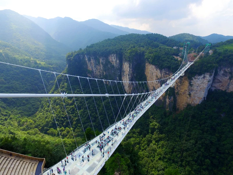 橋とガラスのプラットフォームを組み合わせると、高さのあるアトラクションによくある張家界ガラス橋になります。張家界国家森林公園では、かつて世界で最も高く最長のガラス橋であった峡谷に 1,400 フィート伸びています。 横からの眺めも素晴らしいですが、やはり圧巻なのは下からの眺めです。下の峡谷は、ほぼ 2,000 フィート上から見た木々の水彩画にすぎません。安全上の理由から、橋には 1 時間あたり 800 人の制限があります。