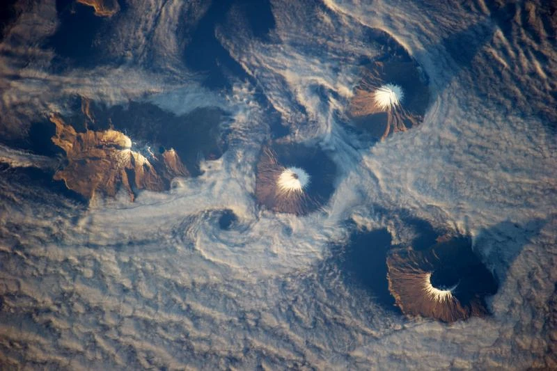 クリーブランド山の噴火に伴い、大気中に広がった灰雲の様子が宇宙ステーションから鮮明に映し出されています。灰色の巨大な塊が大気中に浮かび上がり、その奇妙な形状は時折変化を見せながらゆっくりと流れていきます。この灰雲は火山灰と硫黄ガスなどが混じり合って形作られたもので、高度の違いによって太陽光の当たり具合が変わり、幻想的な色彩の濃淡を生み出しています。しかしこの柔らかな印象とは裏腹に、そこには自然の持つ破壊的な力が秘められています。火山の噴火によって放出された膨大な量のエネルギーは、周囲の生態系に深刻なダメージを与えかねません。まるで大気をも飲み込むかのようなその脅威的な姿は、自然の猛威をあらわにしています。それでも周りの青空が続いていることから、生命の たくましさも同時に感じ取ることができるでしょう。
