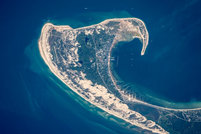 ケープコッドは、国際宇宙ステーションからの視点で眺めるとまったく異なった印象を受けるはずです。マサチューセッツ州の先端にあるこの半島は、約2万年前の最終氷期に形作られた地形です。大規模な氷河によって削られた跡が、現在の複雑な海岸線の起伏を生み出しています。宇宙からみれば、海に突き出したフック状の半島部分が目を惹くでしょう。本州からは徐々に細くなった半島が、いったん内湾を形成してから再び湾口が屈曲しながら先端に達する様は、一見奇妙な印象を受けるかもしれません。しかしこのユニークな地形は、長い年月の間に氷河の進行と後退が繰り返されたことによってもたらされた自然の産物なのです。辺り一面を覆っていた氷河が解けた後、残された跡が現在の地形を形作ったのです。単純な直線的な海岸線ではなく、こうした複雑で有機的な曲線が生まれたことが、まさに自然の不思議な側面を物語っているといえるでしょう。