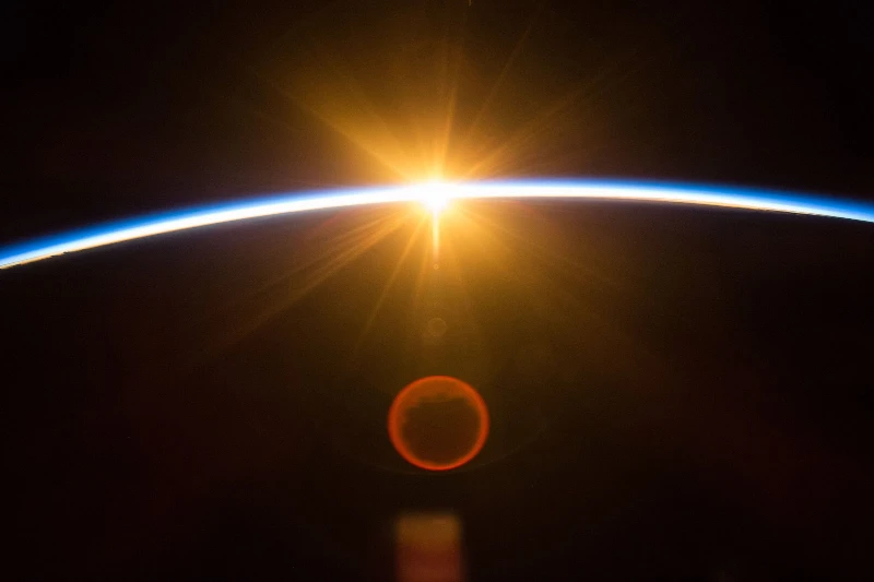 真夏の朝4時頃、宇宙から見た日の出の光景は息をのむほど美しいものです。まだ地上では夜の暗闇に包まれている人々とはうって変わって、宇宙空間からは地球が徐々に太陽の光に包まれていく様子が見渡せます。薄明かりの中、地球上の大地が次第に明るさを増していく様は壮観そのものです。東の地平線が徐々に赤みを増し、やがてオレンジ色の太陽の輪郭が現れ、いっそう明るくなっていきます。はじめ神秘的な光に包まれていた地球が、次第に太陽のエネルギーで輝きを増し、生命の営みが目覚めていく様を間近に感じ取ることができます。この数分間の地球の姿の変化は、自然の繰り返される営みを表しているといえるでしょう。宇宙からこの聖なる光景を仰ぐことができるのは、人間にとって最大の特権なのかもしれません。地球という生命の存在そのものが、宇宙に抱かれながら循環していることを改めて実感させられます。