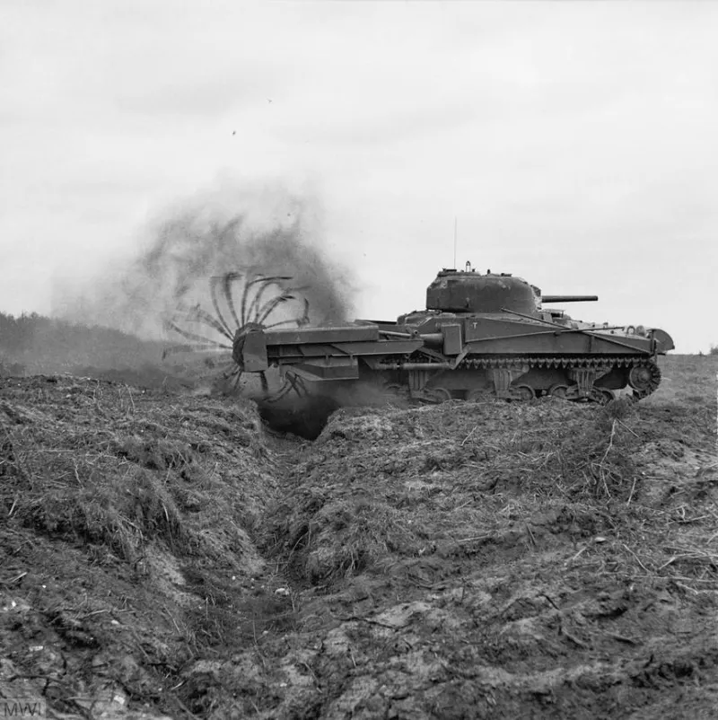 「カニ」と呼ばれるシャーマン戦車は、地雷除去のための特別な装備を備えています。この装備には、ローラーと重り付きの鎖が含まれています。連枷戦車という概念自体は新しいものではなく、1942年のアラマン戦で初めてマチルダ戦車に「サソリ」式の連枷が装着されました。その後、ホバートの指導のもと、この「サソリ」式連枷はシャーマン戦車に適合するように改良されました。